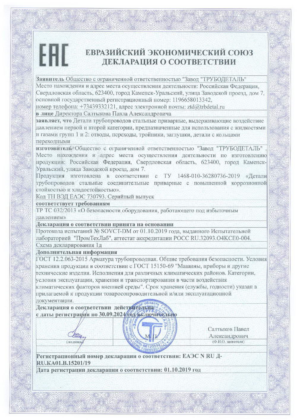 Декларация соответствия ЕАЭС N RU Д-RU.КА01.В.15201/19 на детали трубопроводов стальные приварные, выдерживающие воздействие давлением, 1 и 2 категории, предназначенные для использования с жидкостями и газами групп 1 и 2